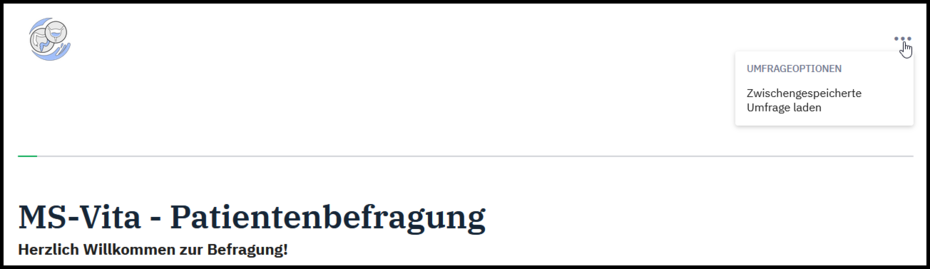 Nun können Sie die Befragung schließen und zu einem späteren Zeitpunkt fortfahren. Wenn Sie den Befragungslink erneut öffnen, können Sie auf der Willkommensseite wieder auf das Drei-Punkte-Symbol am oberen rechten Bildschirmrand gehen und die Option „Zwischengespeicherte Umfrage laden“ auswählen. Nachdem Sie anschließend Ihren vorher festgelegten Benutzernamen und Ihr Passwort eingegeben haben, werden Sie zu Ihrem zuletzt abgespeicherten Befragungsstand weitergeleitet.