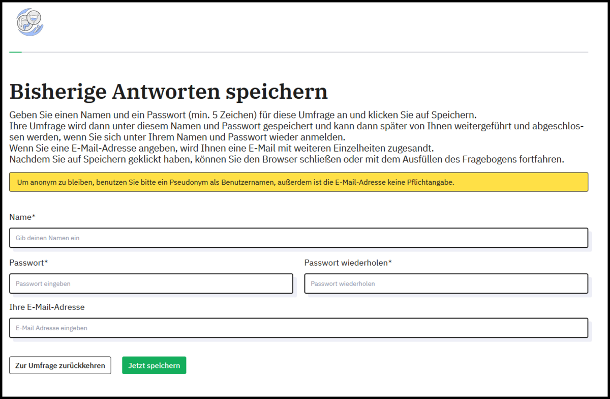 Der von Ihnen festgelegte Benutzername, um die unterbrochene Umfrage nach einer Pause zu laden, sowie die optionale E-Mailadresse werden nur für einen Administrator der MSFP-gGmbH und nur solange, bis Sie die Umfrage beendet haben, zwischengespeichert. Nachdem Sie die Befragung auf der letzten Seite abgesendet und damit vervollständigt haben, werden Ihre Zugangsdaten und Ihre optionale E-Mailadresse gelöscht und die Anonymität Ihrer Umfragedaten sichergestellt. Sollten Sie die Befragung pausieren und anschließend nicht innerhalb von zwei Wochen vervollständigen, werden Ihre Zugangsdaten und Ihre optionale E-Mailadresse ebenfalls gelöscht und die Anonymität Ihrer bisherigen Umfragedaten sichergestellt.